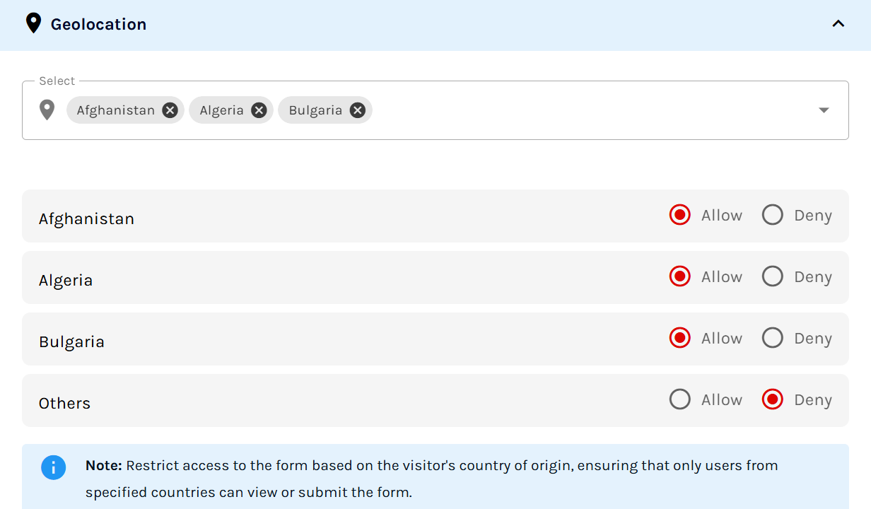 When you have embedded online forms, you are then ready to get users to engage with your forms and capture leads.There is way to show or hide the form based on the country of your page visitors. For example, if you only need leads from a certain country, or few select countries, then geo-location helps you show the form only to those visitors.Also, you can specifically hide a certain country and enabled the rest of the world to view and engage with your forms.Geolocation works automatically understands the location of website visitors based on their IP address and then quickly enables or hides the form based on your set-up.