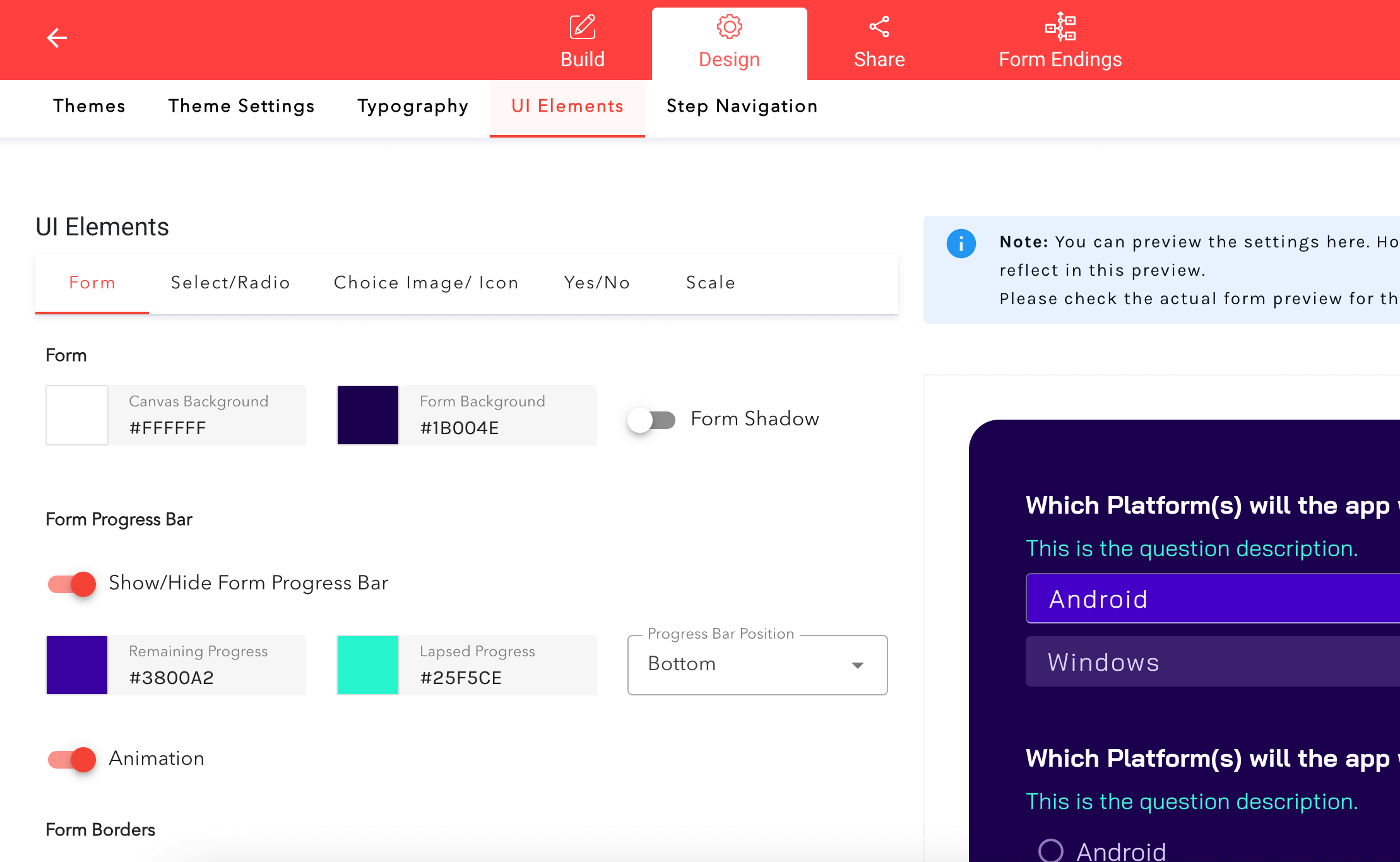 1. It's possible to change the form background color.2. Firstly, open up your form, go to the Design section.3. Then click on UI Elements, Form, Form Background Color. You can change the design by clicking on the color selector or typing in the hex code.