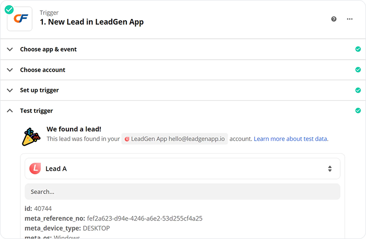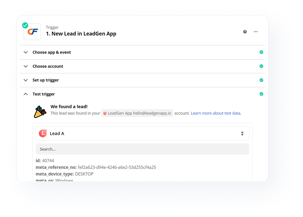 Setting up a zap is easy and just takes a few minutes. Zapier can be used free up to certain usage. Once turned on, your zap performs tasks automatically and passes on your leads to your connected apps.