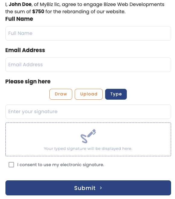 Collect legally recognised signatures directly within your forms. Your respondents simply draw, type, or upload their signature and submit in seconds. Works seamlessly on desktop and mobile. Every signature is timestamped and securely stored, giving you a clear audit trail for compliance and record keeping.