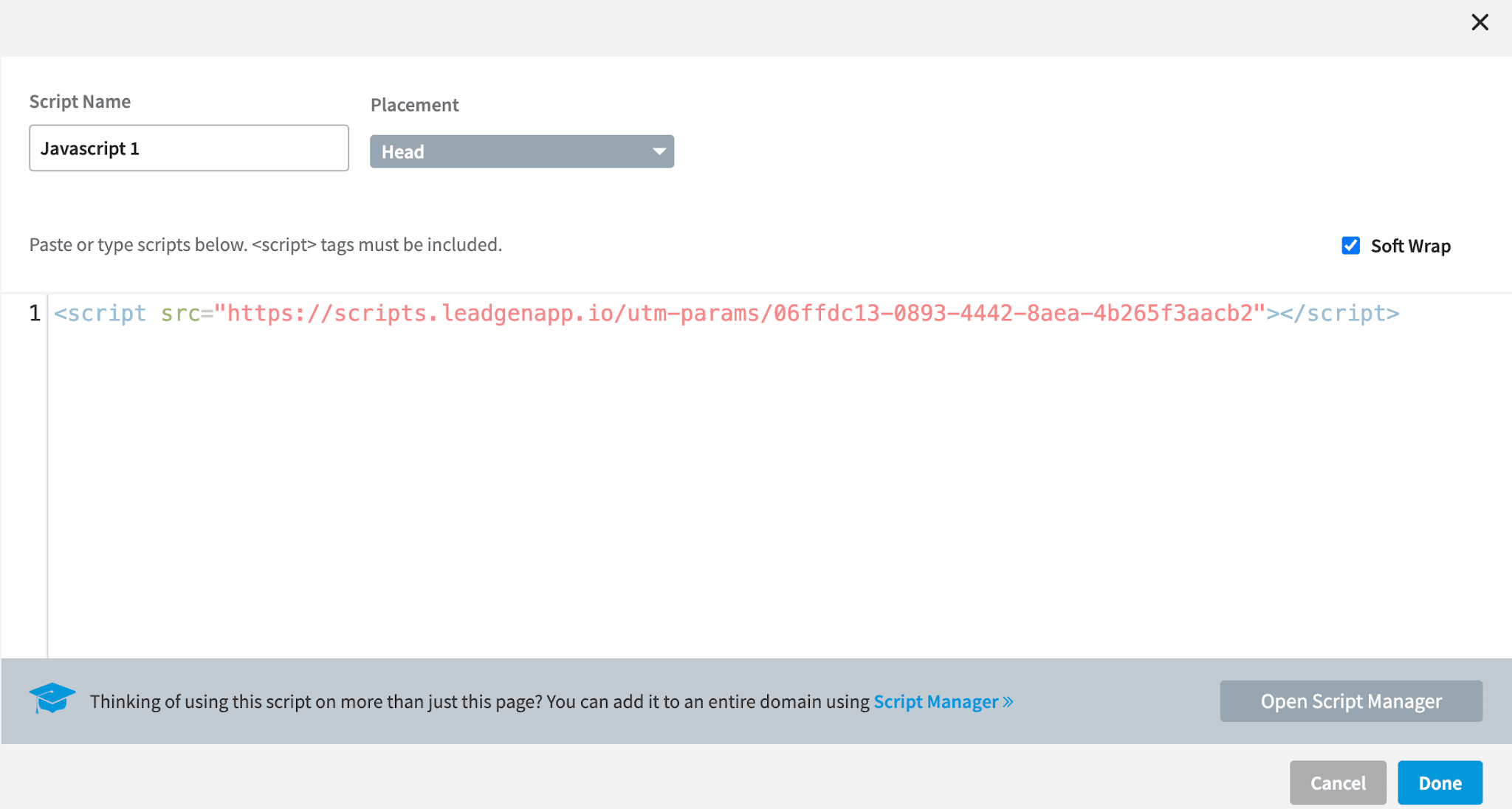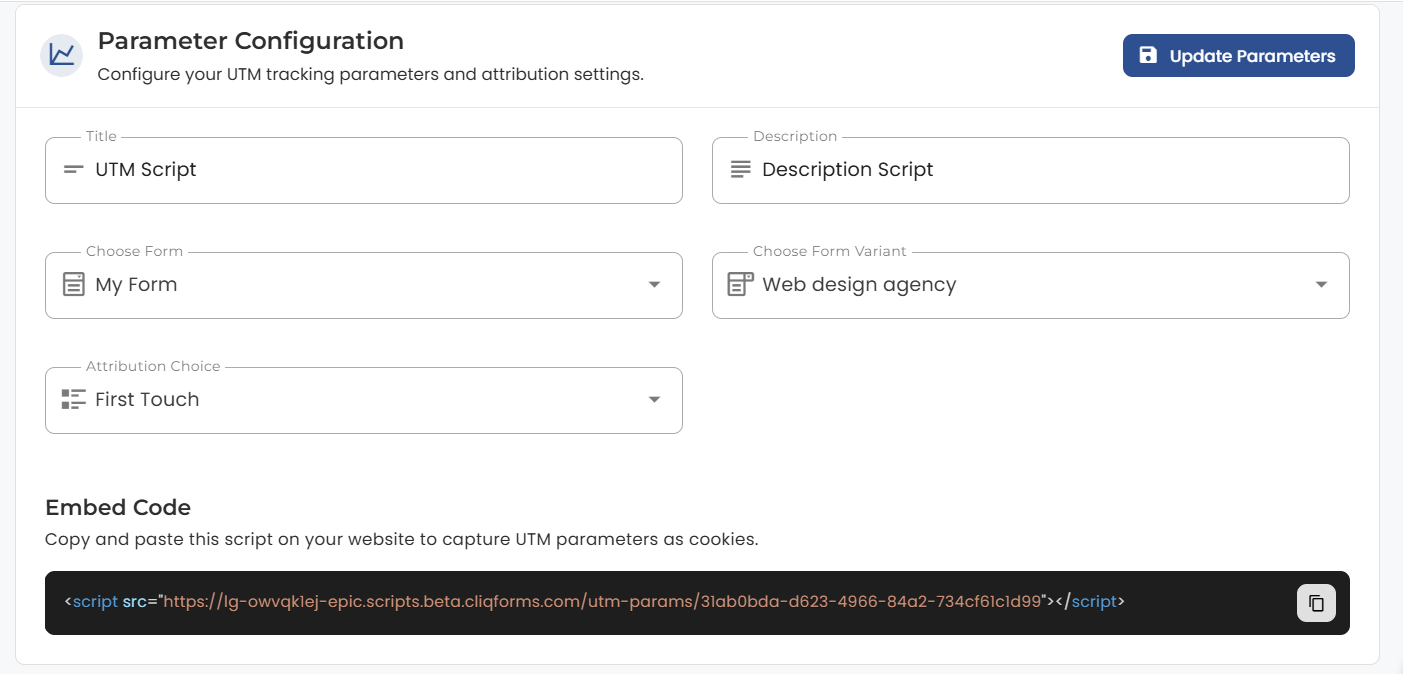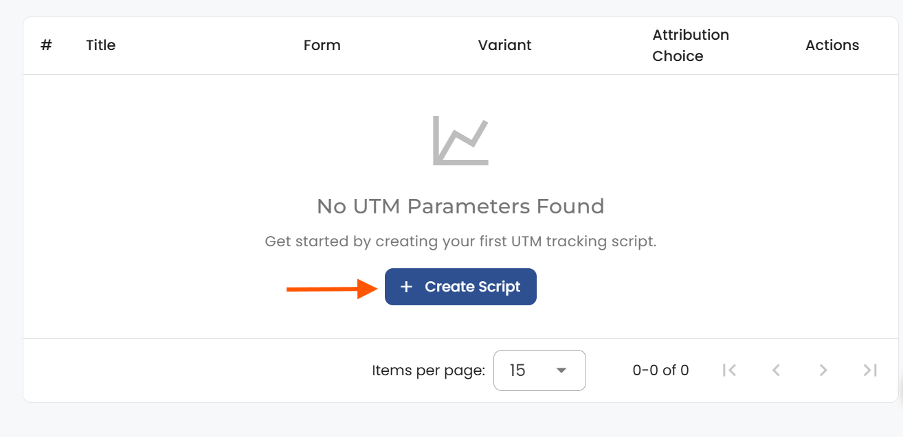 Add New Parameter: Click on the âCreate Scriptâ button to open the UTM parameter configuration form.